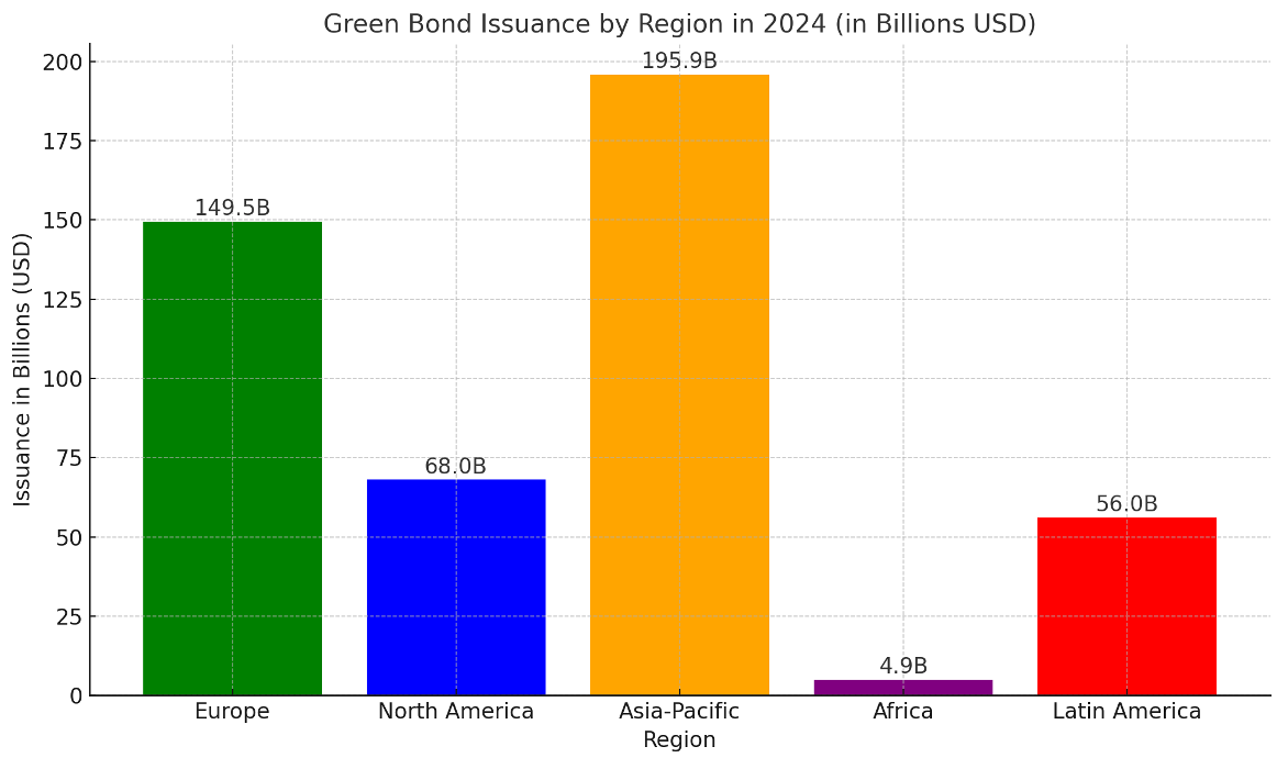 The bar graph illustrates the distribution of green bond issuance across various regions in 2024. Asia-Pacific leads the market, followed closely by Europe and North America. Meanwhile, Latin America shows steady growth, and Africa is emerging as a developing region in sustainable finance.
